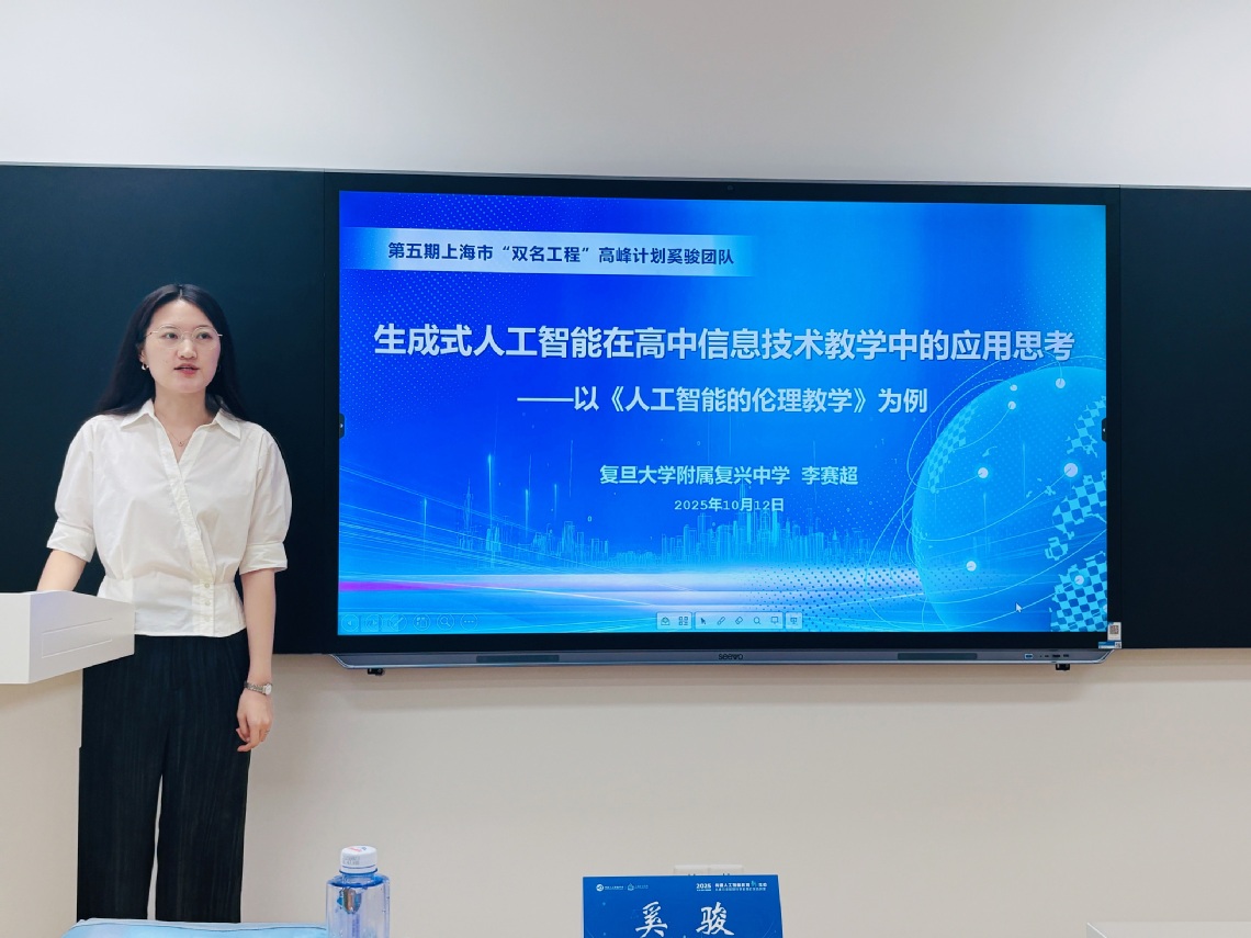 复旦大学附属复兴中学李赛超老师以《生成式人工智能在高中信息技术教学中的应用思考》为题,聚焦AI伦理教学,通过生成式AI创设开放性学习环境,引导学生从技术使用者转变为思考者,培养批判思维与社会责任感。