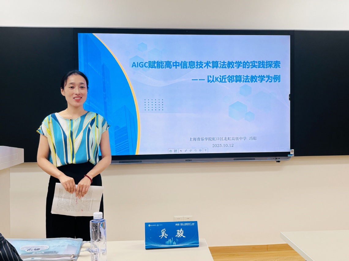 上海音乐学院虹口区北虹高级中学冯聪老师围绕《AIGC赋能高中信息技术算法教学的实践探索》,以盗窃案脚印谜题为情境,设计层层递进的三个实践活动,引导学生逐步理解K近邻算法逻辑。AIGC在情境生成、可视化演示与代码优化中的全程支持,有效提升了课堂参与与理解深度。