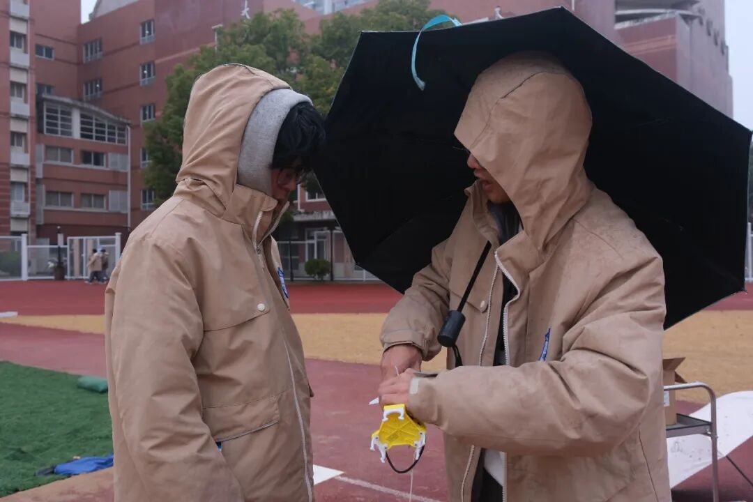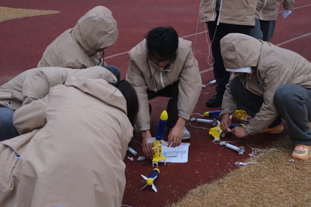 每班由5名同学组队参与,通过团队协作完成从设计、制作到发射的全过程。分组进行准备工作时,一组学生正蹲在地上,仔细检查动力舱的密封性;另一组则在调整十字尾翼的安装角度。在比赛中,参赛者可通过调整空气压力、水量和发射角度等,来优化水火箭的飞行射程。