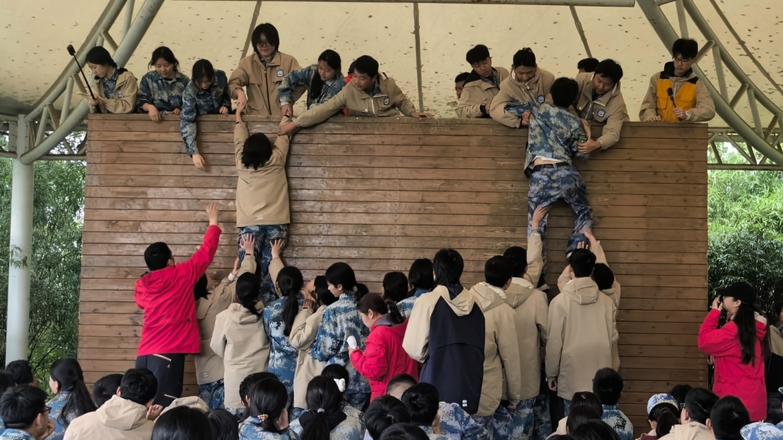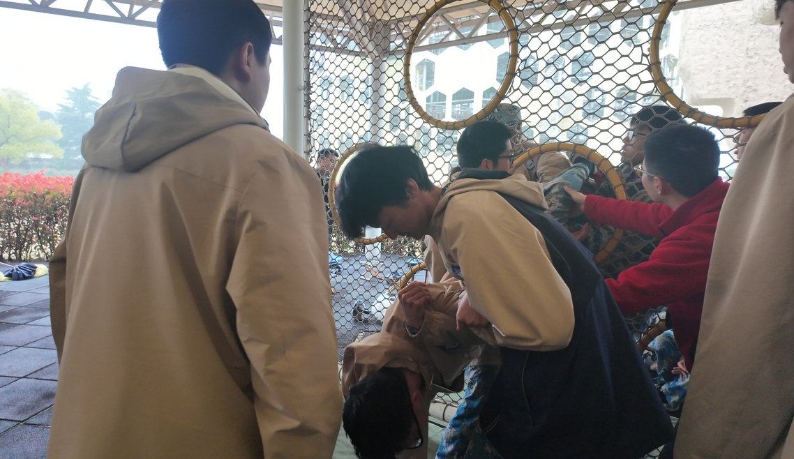 4月3日,是复兴学子在东方绿舟训练的最后一天。上午,我们进行了爬墙活动。规则很简单,全班都要翻过去,不借助工具,只能靠彼此。班级同学相互配合,底下的同学拖着腿,上面的同学负责拽手臂,一点一点地把人拉上来。3米高的木板墙,光溜溜的,没有任何可以抓的缝隙。有的同学体重不轻,但同学们没有一个松手。一个、两个、三个……手臂从酸到麻,但每伸下一次手的时候都没有犹豫。每拉上来一个人,旁边就有人喊一声“好”,声音不大,但很扎实。那一刻我们不再只是“被训练的人”,而是可以被信赖的人。3米高的墙,挡不住大家的团结与配合。