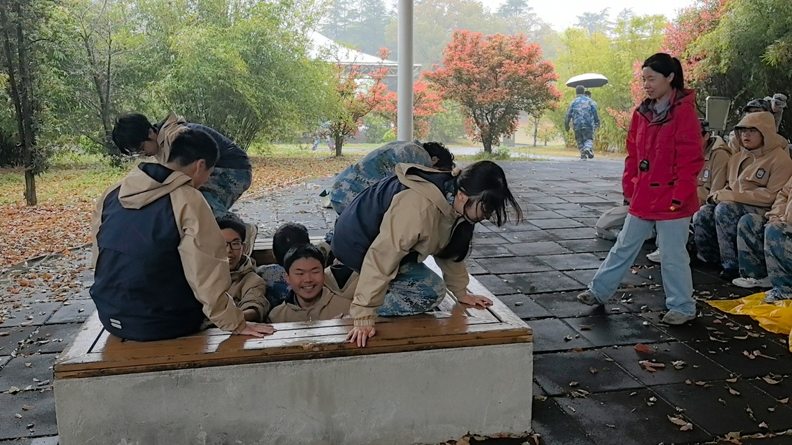 防空洞训练中,我们需要用正确的姿势跳下1.6米高的竖直洞口,躲避“空袭”后再爬上来。“空袭”解除后,男生一起托住女生的小腿,上面的同学同时伸手拉,把她们一个一个送上去。大概是爬墙时攒下的那股默契还在,我们组配合得行云流水。当听到18秒这个数字时,四周的掌声和欢呼声震得耳膜发烫,那一刻我明白,所谓团队,不是各自发光,而是互为阶梯,团结一心。