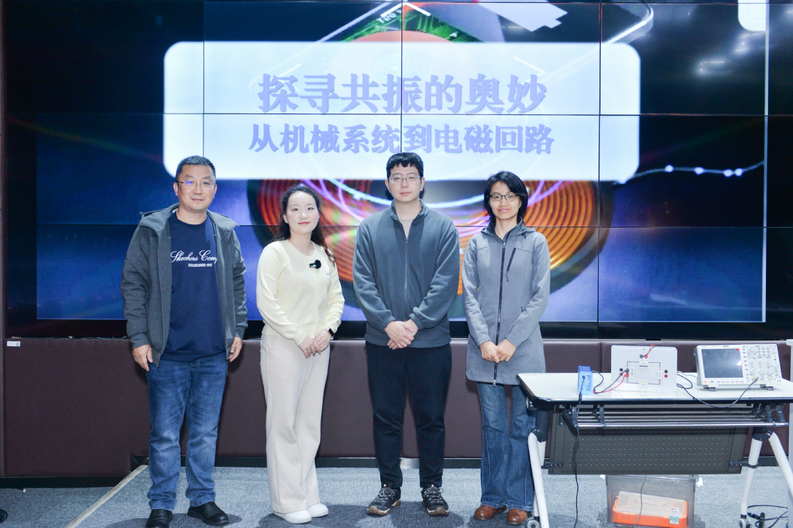 本次活动的主讲人为复旦大学物理系的陈思颖老师。课程起始阶段,陈老师以Lato Lato碰碰球奇妙的共振现象作为切入点,引发大家的好奇心,自然地引出并清晰地帮助我们回忆在高一时学习的机械系统中的共振现象。由此,陈老师从机械系统引出电磁回路中的谐振现象并清晰地阐述了LC振荡电路的特点。此后,陈老师并未局限于理论层面的讲解,而是独具匠心地设计了测量LCR回路的谐振频率实验。她引导学生亲自操作并进行实验观察,让学生亲自测量出LCR回路的频响曲线中的部分数据,从而将书本上的理论转化为课堂上的实际操作,使抽象的概念变得具体可感。最后,陈老师将理论延伸至日常生活,深入浅出地剖析了共振现象在生活中的用处,达成了从基础科学到真实生活的完美衔接。