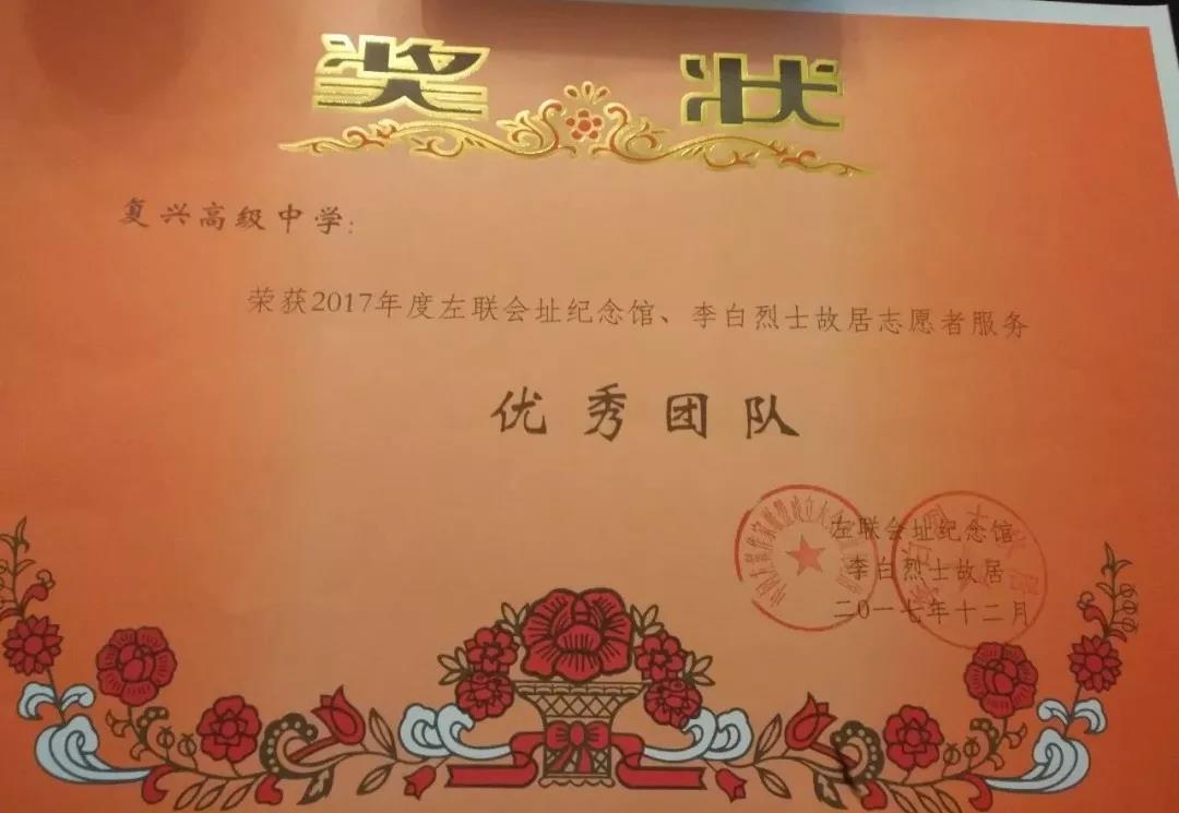 我校高二(5)班郑婷菲同学荣获“2017年度左联会址纪念馆、李白烈士故居志愿者服务优秀志愿者”称号.