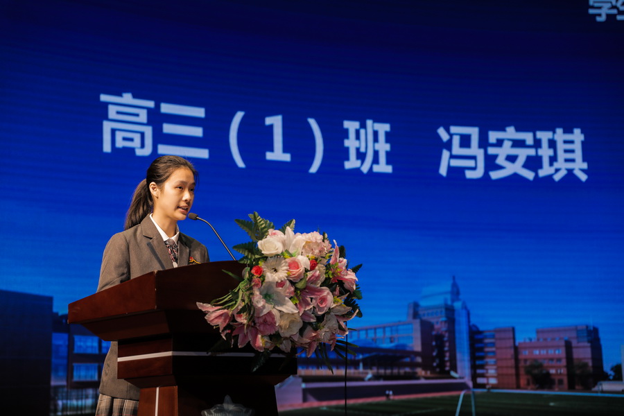 高三(1)班同学冯安琪作为学生代表发言。她回顾了过去一年在防控疫情、线上学习等重要经历中产生的收获与成长,结合自己的思考与感悟,向高一高二年级的学弟学妹提供了宝贵的学习建议,并向全体同学倡议,在新的一个学期要厚植爱国主义情怀,树立远大理想,坚持勤奋学习。