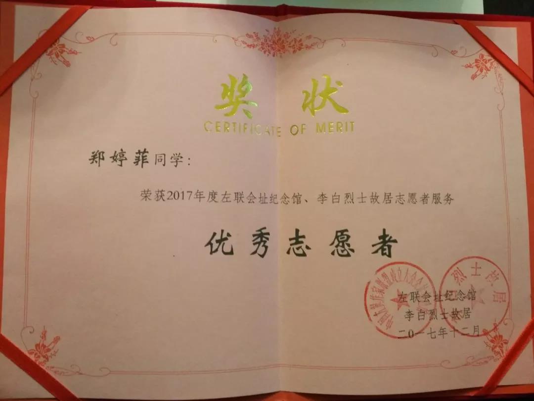 我校高二(5)班郑婷菲同学荣获“2017年度左联会址纪念馆、李白烈士故居志愿者服务优秀志愿者”称号.