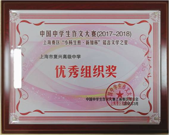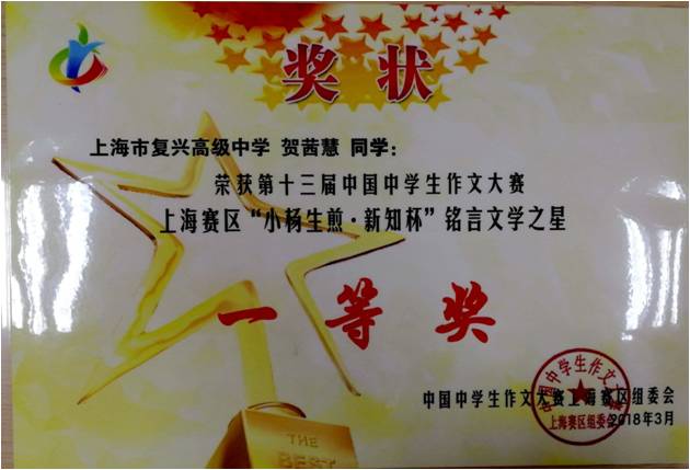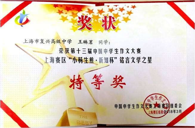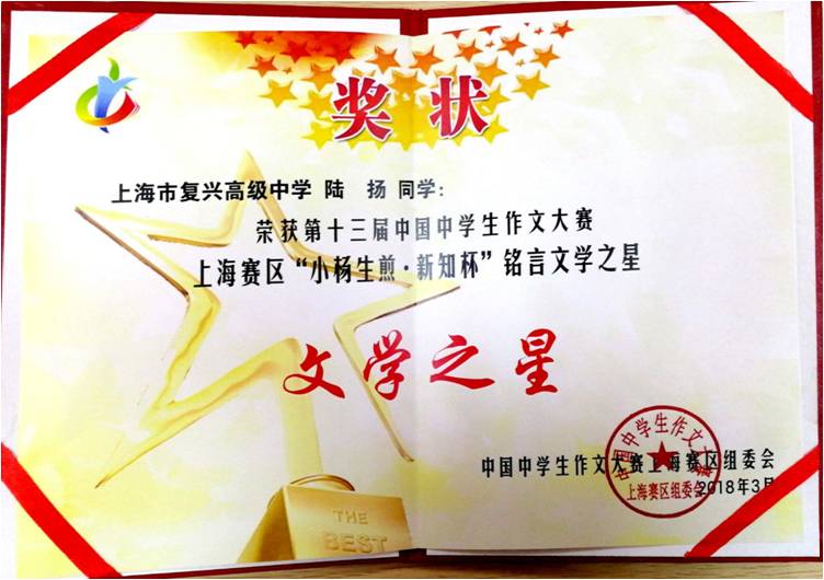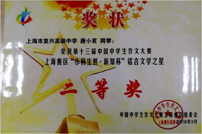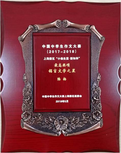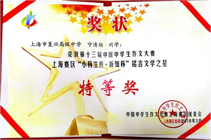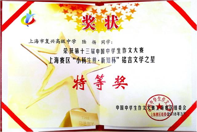 日前,“新知杯”第13届中国中学生作文大赛上海赛区成功举办。经过严格的预赛选拔、初赛竞争、区赛角逐,我校荣获“优秀组织奖”,陆扬、王茗琳、宁清扬、贺茜慧、唐小茗等5名学生脱颖而出,在上海赛区中分获特等奖、一、二等奖。同时,陆扬同学还荣获新知杯最高奖项“铭言文学之星”称号。让我们向获奖同学表示祝贺,也预祝她们在全国总决赛中再创佳绩!