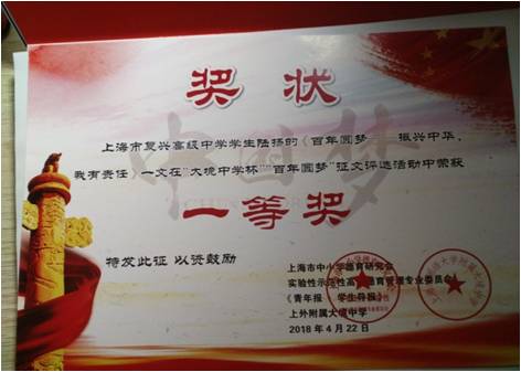 为深入学习贯彻党的十九大精神,进一步加强学生的理想信念教育,进一步增强学生的社会责任感,提高学生思想道德素养,上海市中小学德育研究协会实验性示范性高中德育管理专业委员会、青年报社《学生导报》与上海外国语大学附属大境中学共同组织开展“大境中学杯•百年圆梦”主题征文评选活动。