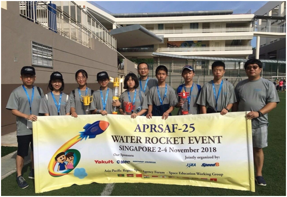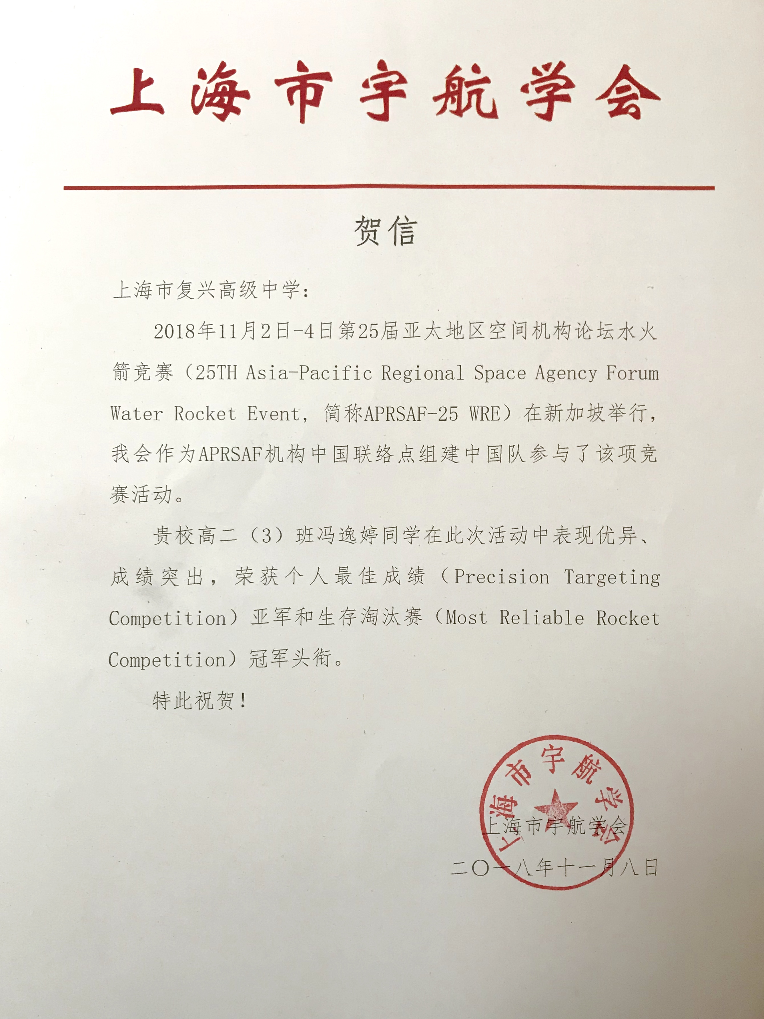 2018年11月2日-4日,第25届亚太地区空间机构论坛水火箭竞赛(25TH Asia-Pacific Regional Space Agency Forum Water Rocket Event, 简称APRSAF-25 WRE)在新加坡举行,共有来自亚太地区12个国家的61名选手参赛。我校高二(3)班冯逸婷同学作为由上海市宇航学会组建的中国队7名参赛选手之一,在日常训练中勤于思考、动手,在竞赛过程中沉着冷静、有条不紊、发挥出色,取得了优异的成绩,在生存淘汰赛(Most Reliable Rocket Competition)中以两发连中靶圈的优异成绩夺得冠军以及个人最佳成绩(Precision Targeting Competition)的亚军,实现了中国队在该项目竞赛中奖牌“零的突破”,创造了中国队参赛以来的最佳战绩。