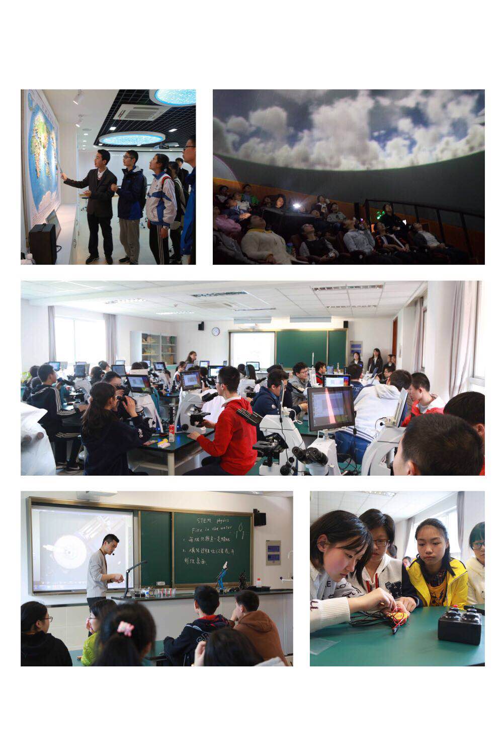 在物理实验室,学生们进行了STEM课程体验,完成了名为Fire in water的实验,感受了物理探究的乐趣;在化学实验室,学生们做了“水果电池”实验,并就观察到的细节,进一步了解所涉及到的化学知识及实验技巧;在生物实验室,学生们学习了如何使用电子显微镜进行观察;在数字地理实验室,学生们通过地形图等工具深化对地球家园的认识;在天象馆,学生们通过球幕影厅观看了火箭发射的全过程。高端的科技项目和学习环境,撬动了初三学生参与科研、追求真知的初心。