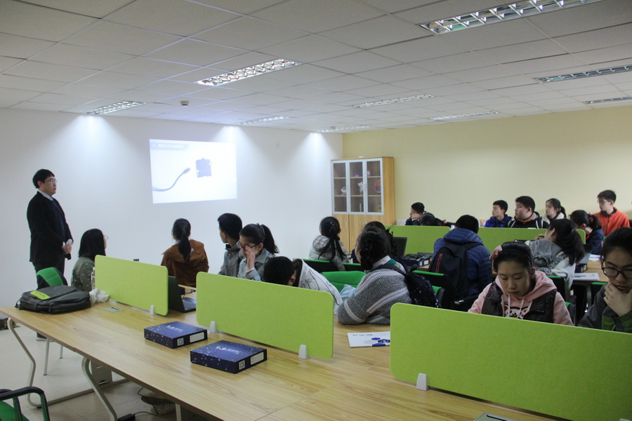 在9208报告厅,初三学生们随着复兴科创小达人一起开始了科创之旅。来自高二(7)班学生王一澄讲述了他的课题《基于虚拟场景的行动障碍康复训练仪研究》,分享了做科研心路历程:如何从发现问题到形成课题、如何设计实验到做好实验、如何从收集数据到分析数据得出结论、如何团结团队形成合力等;最后王同学介绍了在课题研究过程中,复兴在课程、学生活动、实验室、专家辅导等方面给予学生的帮助和支持。这位科创小达人的科创故事,让在场的初三学生跃跃欲试,期待自己也能在研究性学习上大展拳脚。