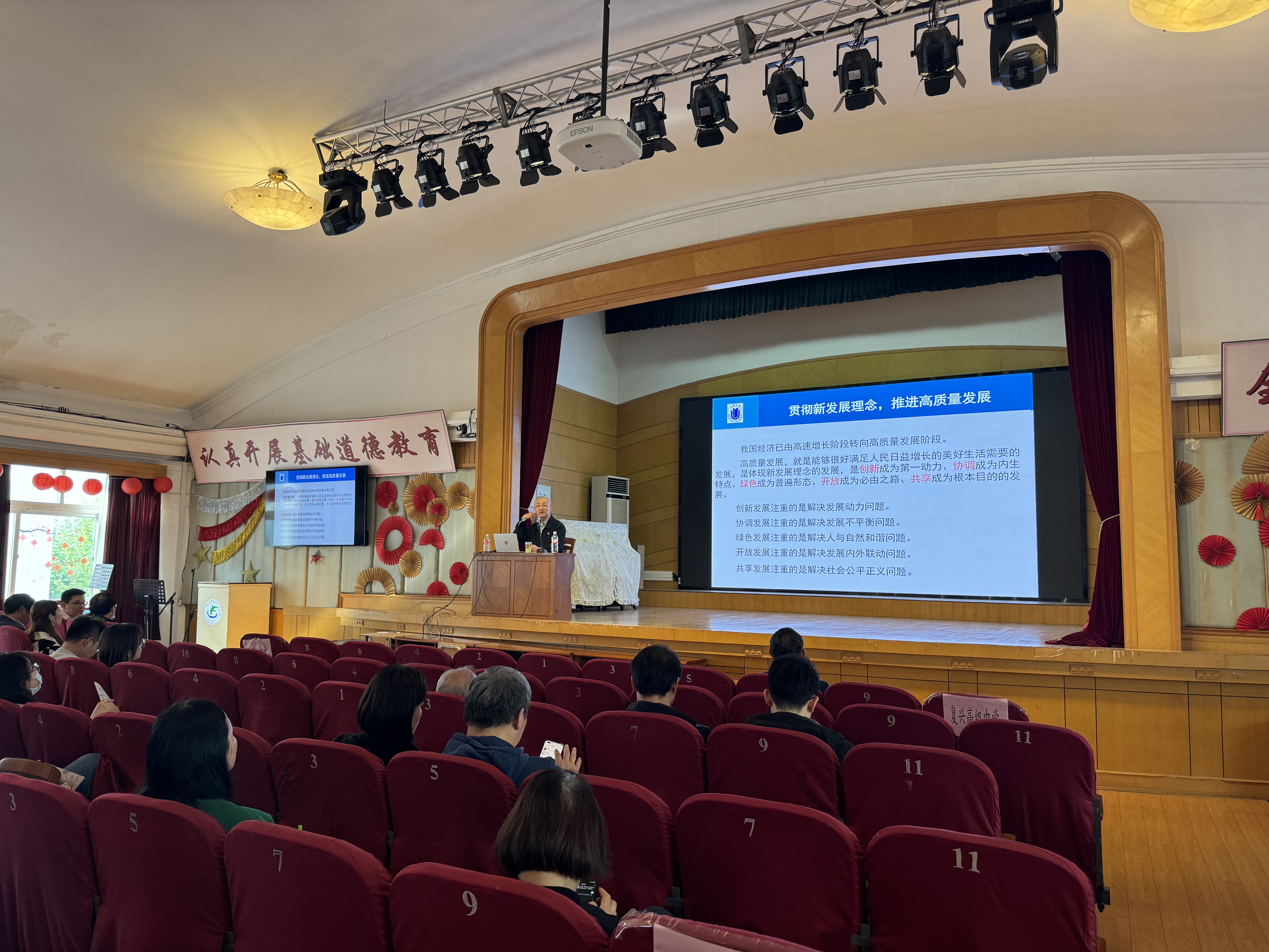 2024年4月26日,复兴教育集团、民办新复兴初级中学关工小组特邀来自上海大学快乐讲师团的复兴老校友裴仁清教授做题为《实现制造强国是贯彻新发展理念,推动高质量发展的必由之路》的讲座。复兴高级中学、民办新复兴初级中学、复兴实验中学、虹口区教育学院实验中学的党员教师们齐聚新复兴大礼堂,认真聆听学习,深度感悟思考。