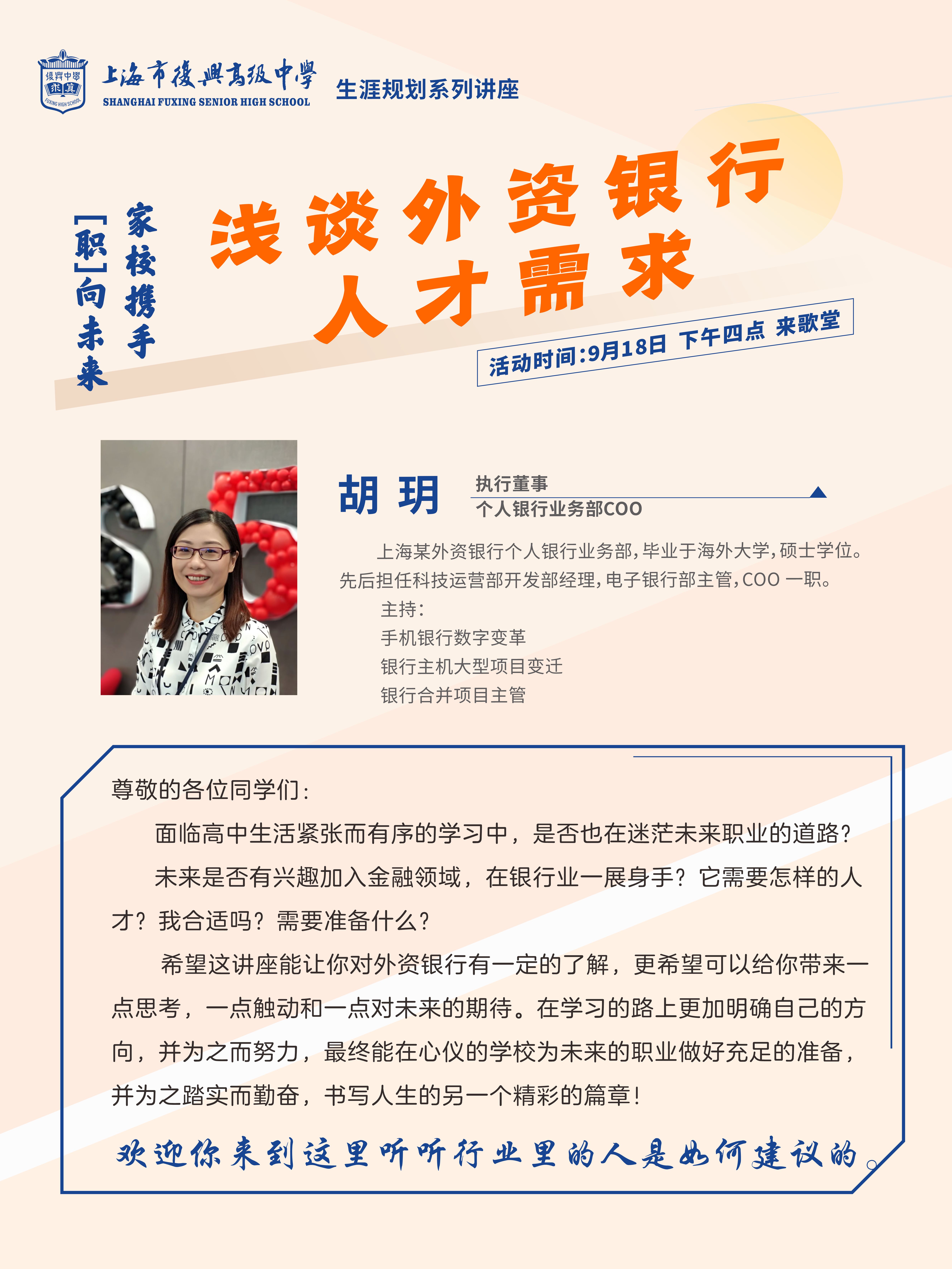 9月18日生涯课上,我校邀请了一位学生家长胡玥女士为立达学部学生做了一场“浅谈外资银行的人才需求”的讲座,胡玥女士是某外资银行执行董事,她从服务范围、技能需求、员工责任等方面带领同学们走进外资银行的世界,揭开“银行家”的神秘面纱,这场讲座不仅拓宽了同学们的视野,也为同学们未来的道路提供了引导。